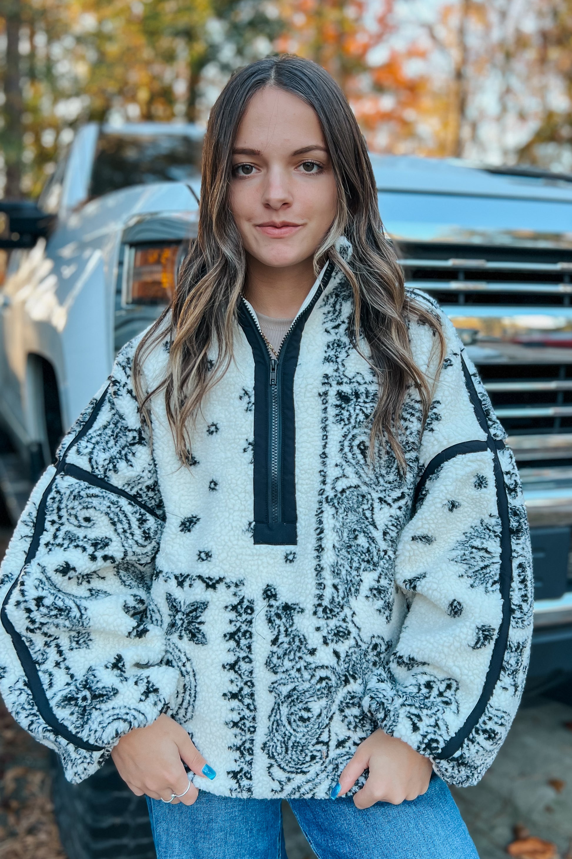 Kick up your boots and chase the sunset in the Bloom Sherpa Jacket. This cozy fleece jacket features an allover abstract floral print, a high collar, and a half-zip front closure — perfect for layering over tees or flannels on chilly mornings. Long sleeves with elastic cuffs, dropped shoulders, and contrast trim give it a relaxed, effortlessly western fit. Whether you’re at the rodeo, running errands, or enjoying a bonfire under the stars, this sherpa is your new go-to for warmth and cowgirl style.