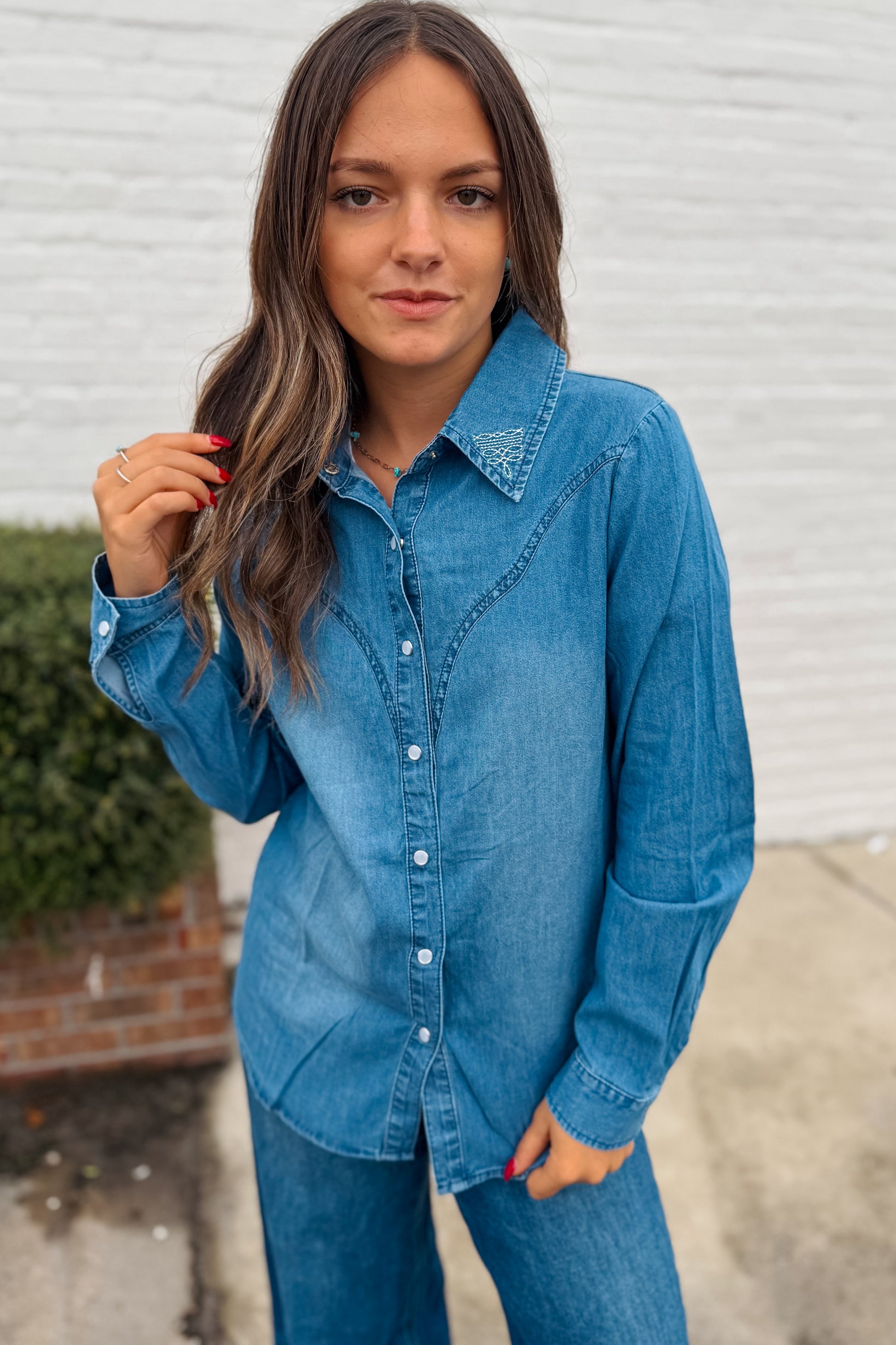 A soft and lightweight denim tencel long sleeve top with embroidered back and embroidered collar. These are a slender fit, perfect for layering under your favorite pullover!