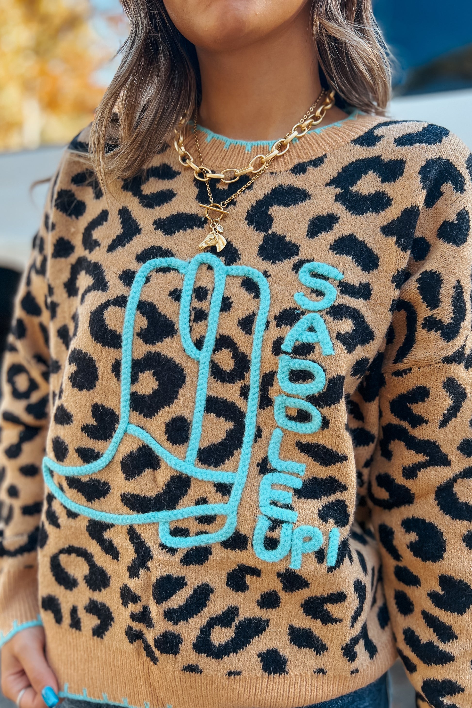 Unleash your wild side with the Boot & Whipstitch Leopard Sweater! This bold, cozy statement piece combines fierce fashion with country charm. Featuring a camel-and-black leopard print, a playful blue cowboy boot graphic, and “SADDLE UP!” stitched across the front, it’s made for cowgirls who love to stand out. Soft, breathable knit fabric keeps you comfy on chilly rodeo nights or layered for fall outings. Contrast blue whipstitch trim along the cuffs, neckline, and hem adds a pop of personality, while the relaxed fit ensures effortless style. Pair it with high-rise flare jeans, turquoise accents, and your favorite boots for a look that takes you from the ranch to the city streets.
