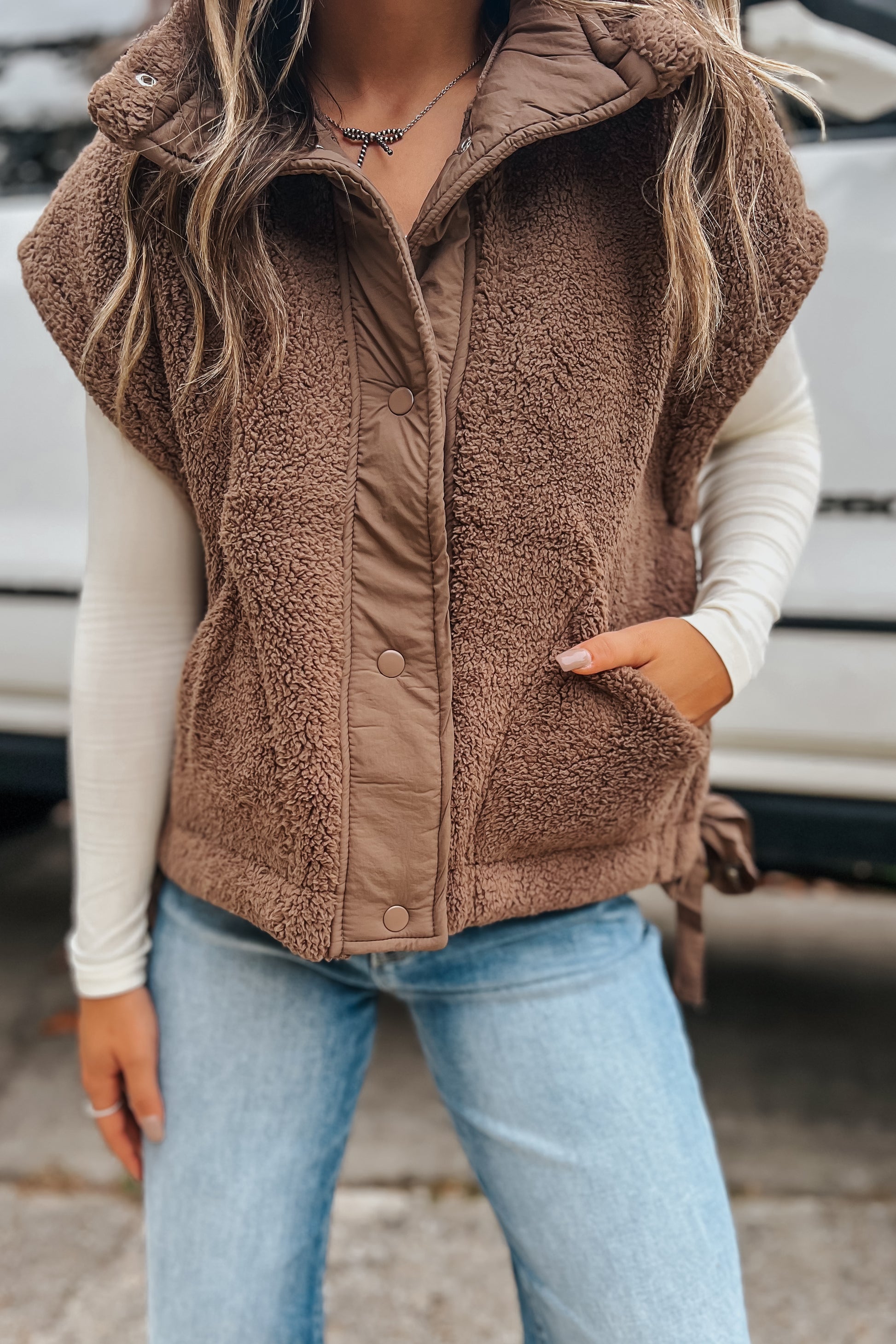 Stay warm and stylish with our Brown Teddy Vest. Made with a plush teddy fabric, this vest offers an oversized fit and a cozy mock neck. Convenient side pockets. Perfect for adding a touch of warmth and fashion to any outfit.