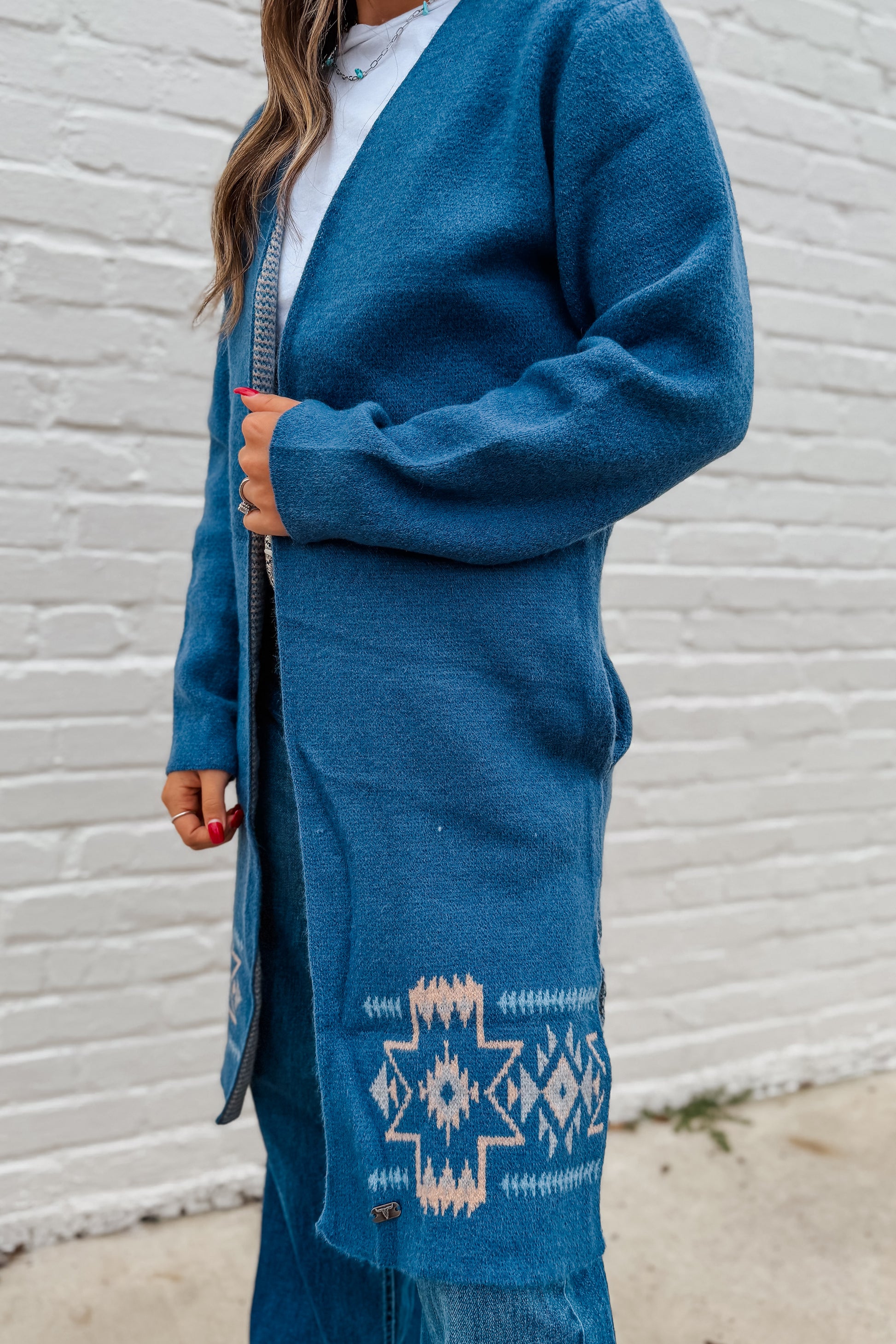 Cowboy Rider Graphic Knit Cardigan in Western Blue. Crafted for the bold Western woman, this cozy open-front cardigan features a detailed jacquard design of a cowboy riding a bucking bronco across the back, surrounded by cream and beige Aztec starburst motifs. The dual-tone design features a soft, textured knit in a rich denim-blue hue with contrasting pale trim along the lapel for dimension. Statement-making yet easy to wear, it’s perfect for Fall layering over denim, tanks, or graphic tees. Slit side hems and front pockets add function to fashion, making this a must-have piece for any western-inspired retailer’s wholesale inventory. Pair with distressed jeans and boots to complete the look that’s as rugged as it is refined.