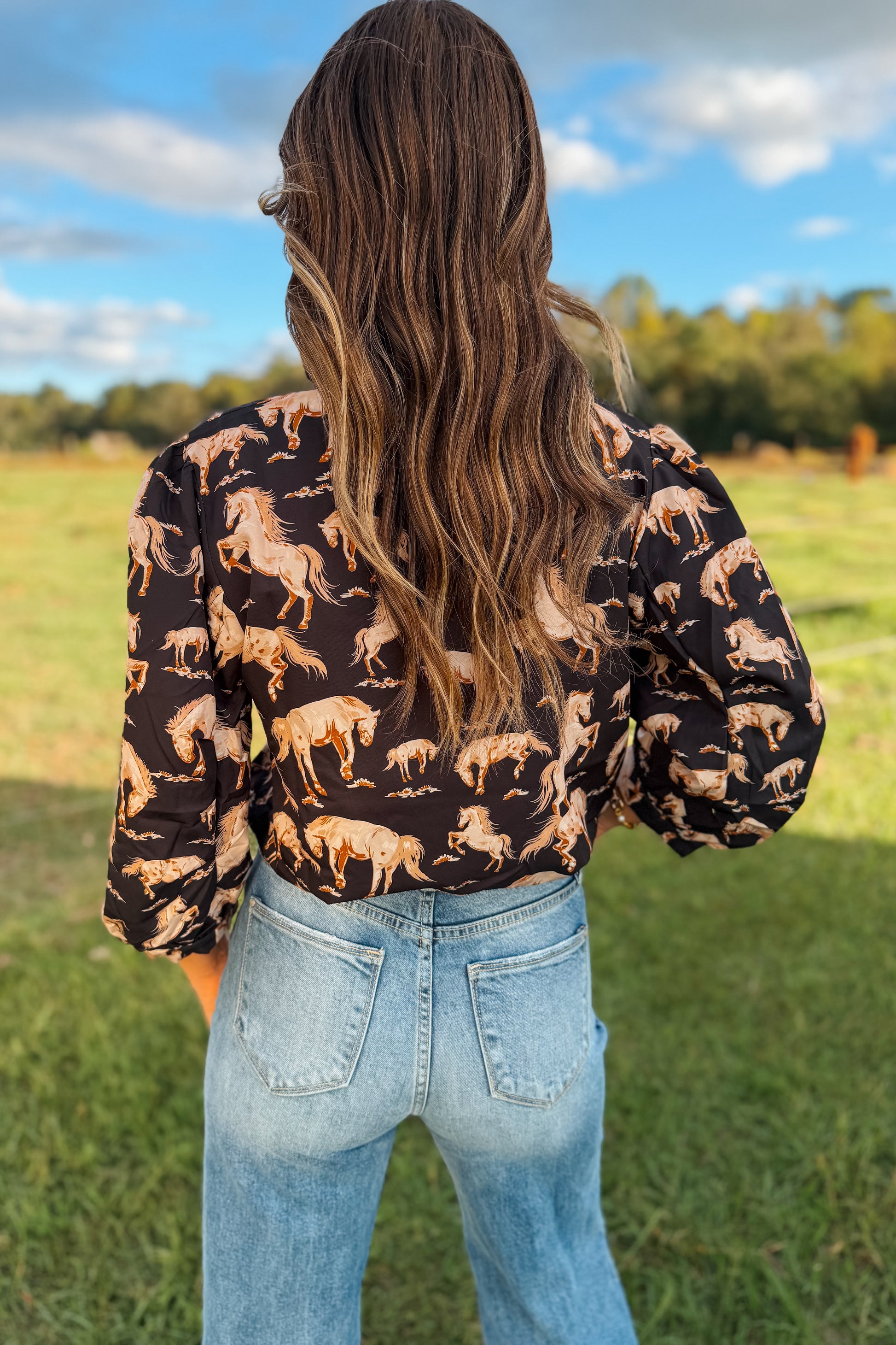 Unleash your inner cowgirl with the Free Rein Blouse. This Western-inspired top features a vibrant print, lightweight polyester fabric, and elegant 3/4 puff sleeves. The split v neck and ruffled collar add a touch of femininity to this versatile piece.