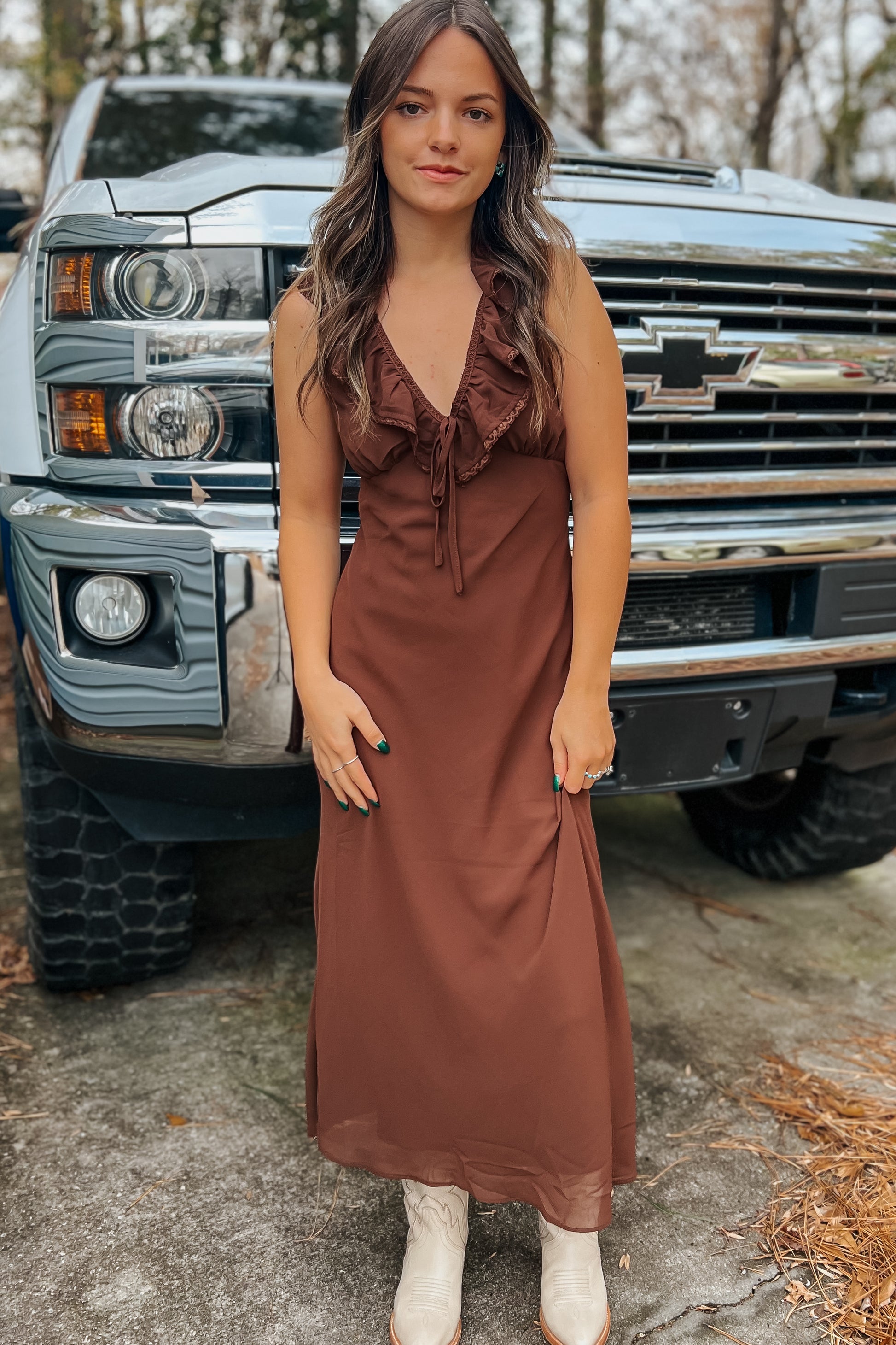 Capture the glow of a prairie sunset in the Golden Hour Maxi Dress. With a soft ruffled V-neck and bias-cut drape, this brown maxi moves like a gentle breeze across the plains. Ideal for rodeos, outdoor gatherings, or sipping sweet tea on the porch, it blends western roots with effortless elegance for the modern cowgirl.