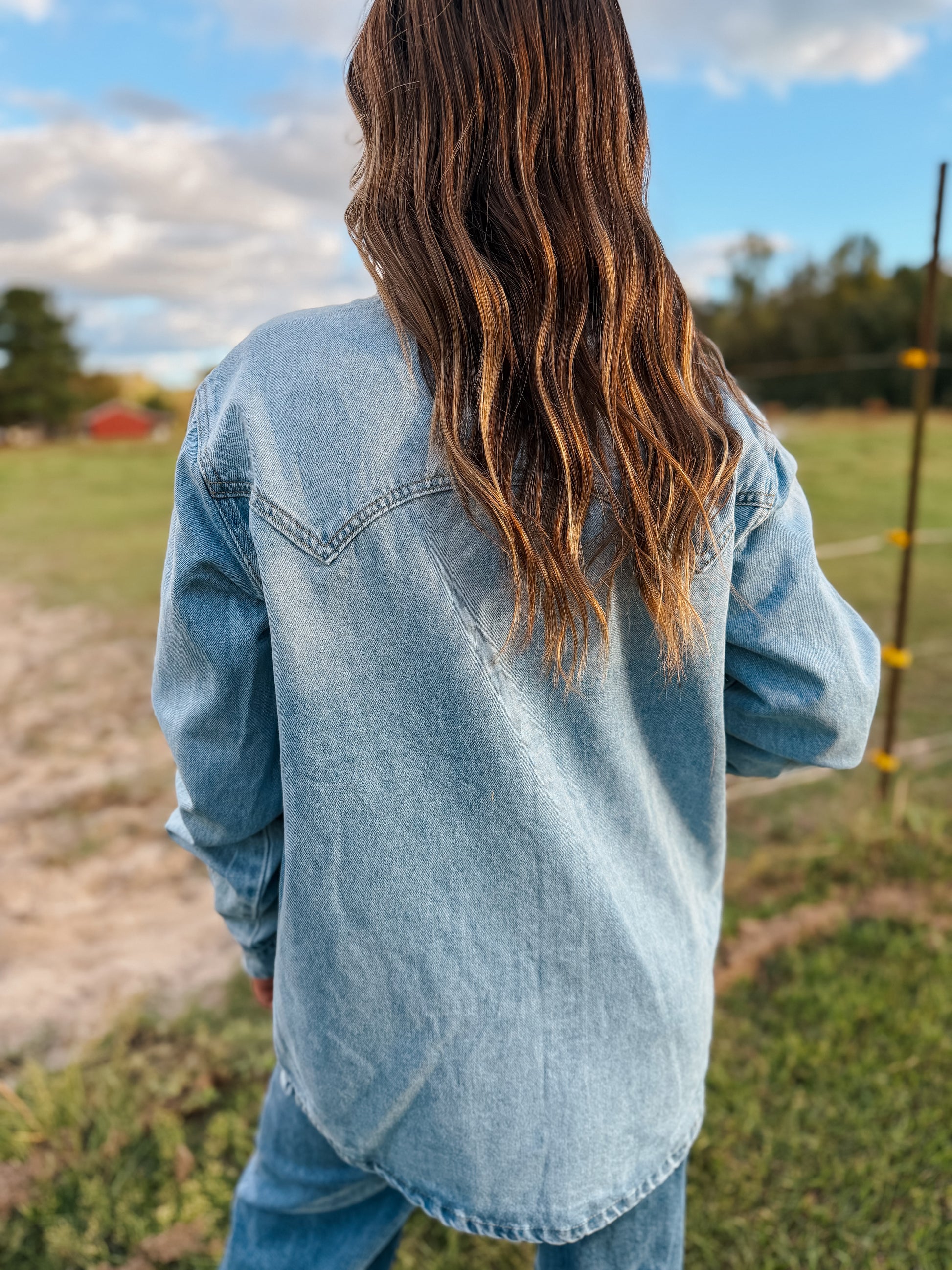 This Western-style denim top features embroidered pockets and a button-up design. Perfect for adding a touch of country charm to your wardrobe. Made from high-quality denim, this top is both stylish and durable. Add it to your collection today and show off your unique style!