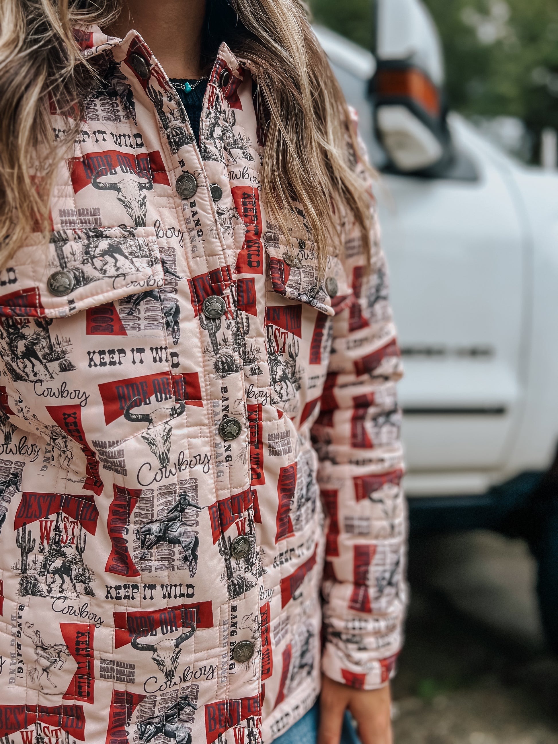 Introducing The Punchy Collage Jacket. This Western quilted jacket features snap buttons and a lightweight quilted design, adorned with a western print. Stay warm and stylish on all your outdoor adventures. Upgrade your wardrobe with this statement piece.