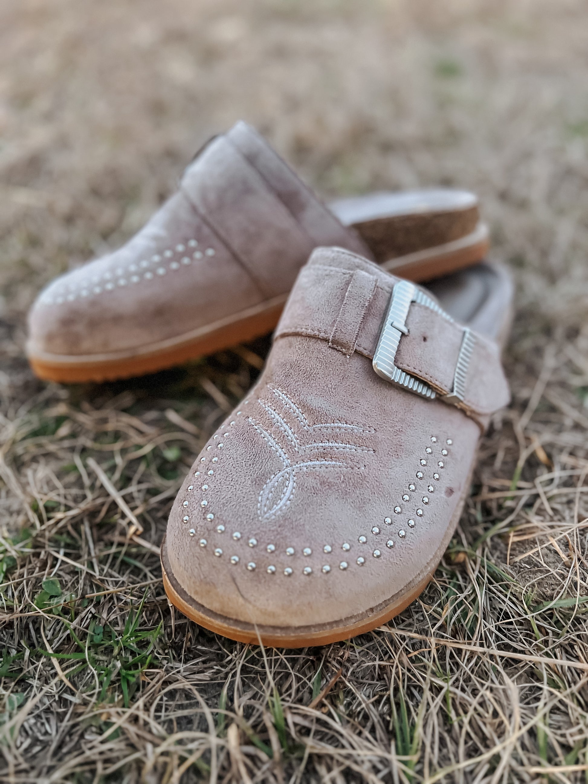 Step into the season with the Josephine Mules — soft sheep suede, a round toe, and a wrapped inner footbed make comfort effortless. Lightweight crepe soles meet statement western buckles for a look that pairs perfectly with linen trousers, relaxed shirts, or your favorite leather pieces. Kick back, stay stylish, and keep it cowgirl-cool.