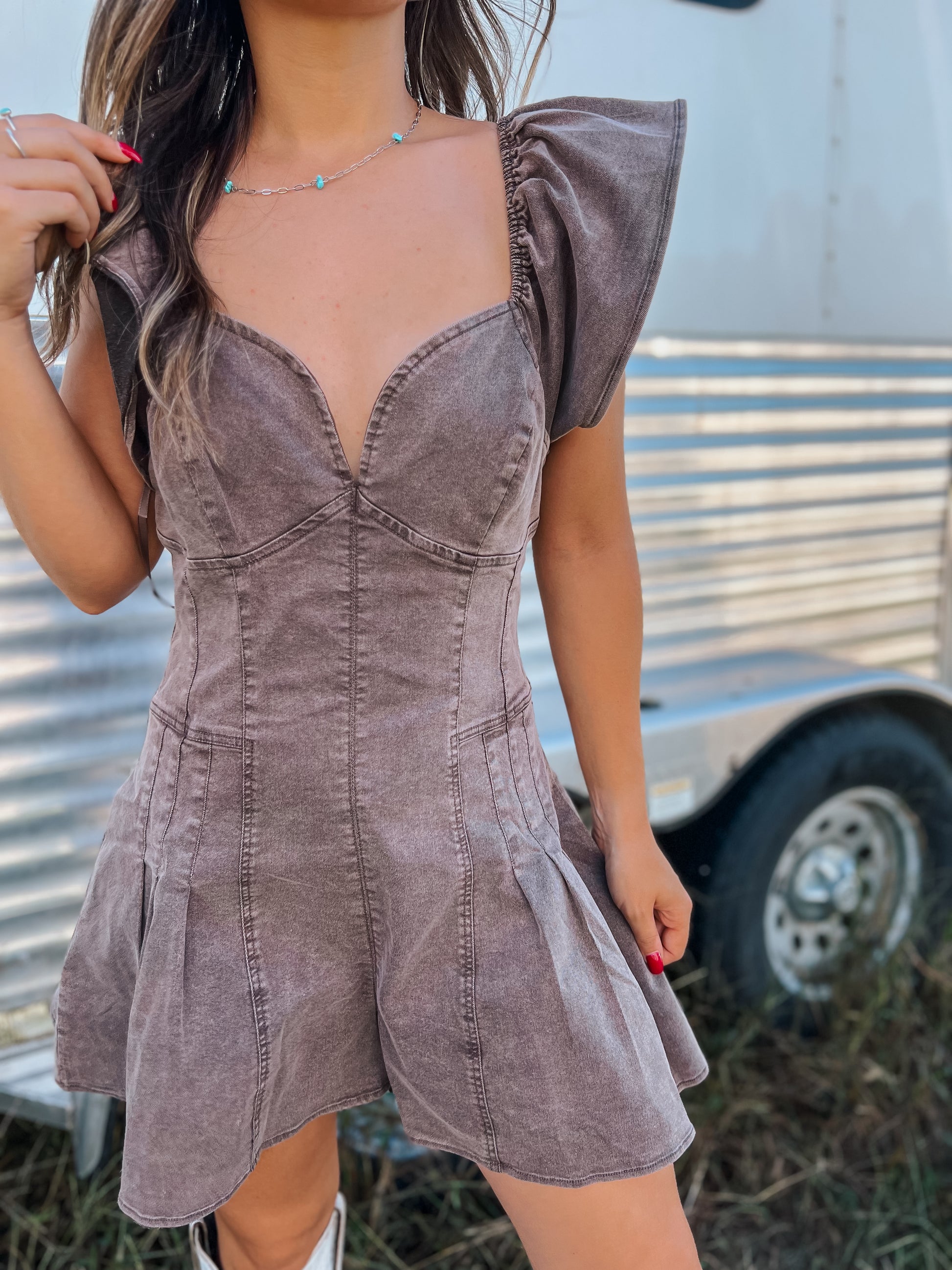 Upgrade your wardrobe with our Sweetheart Ruffle Romper. Made from stretchy brown denim, this romper features feminine ruffle sleeves, pleated hip details, and a tie back design. Its versatile and comfortable design makes it perfect for any occasion. Say hello to effortless style with our romper!