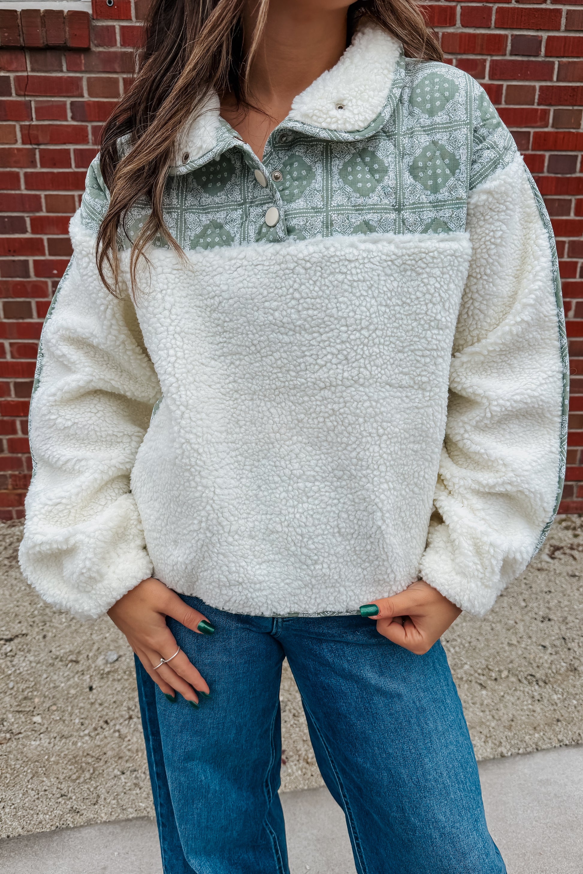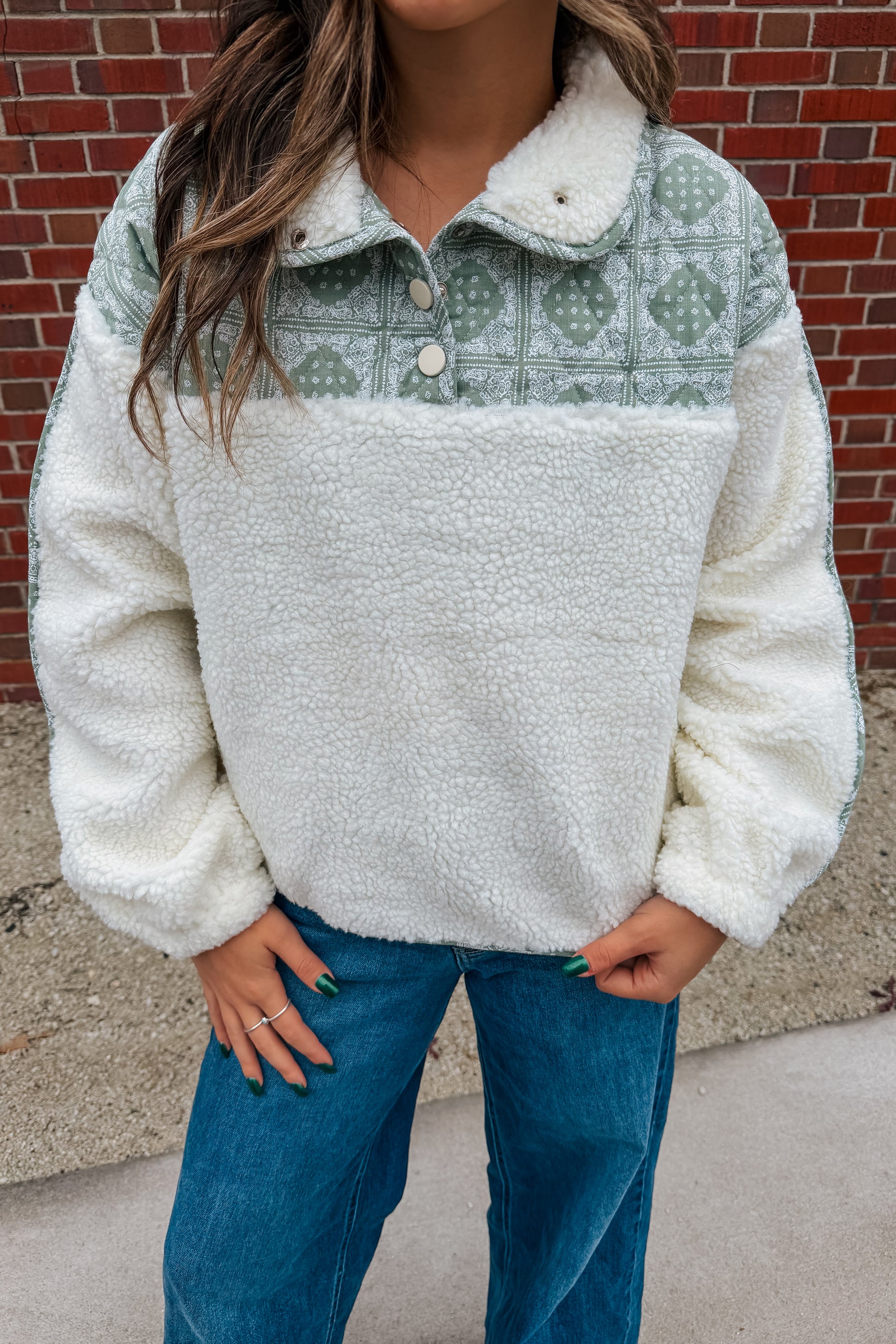 Meet your new campfire companion. This sherpa pullover brings the heat with its soft, snuggly texture and bold quilted bandana-print yoke. The snap-up high neck keeps the cold at bay, while the relaxed, boxy fit makes it an easy throw-on for chilly adventures.