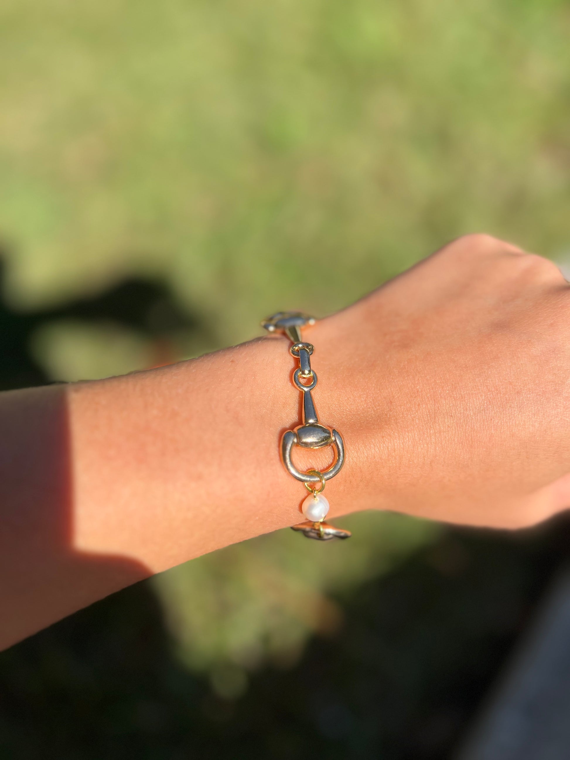 This Derby Bracelet boasts a timeless design with its snaffle bit link and elegant pearl accent. The magnetic closure provides convenience while keeping it secure. Made for the fashion-forward, this bracelet adds a touch of sophistication to any outfit.