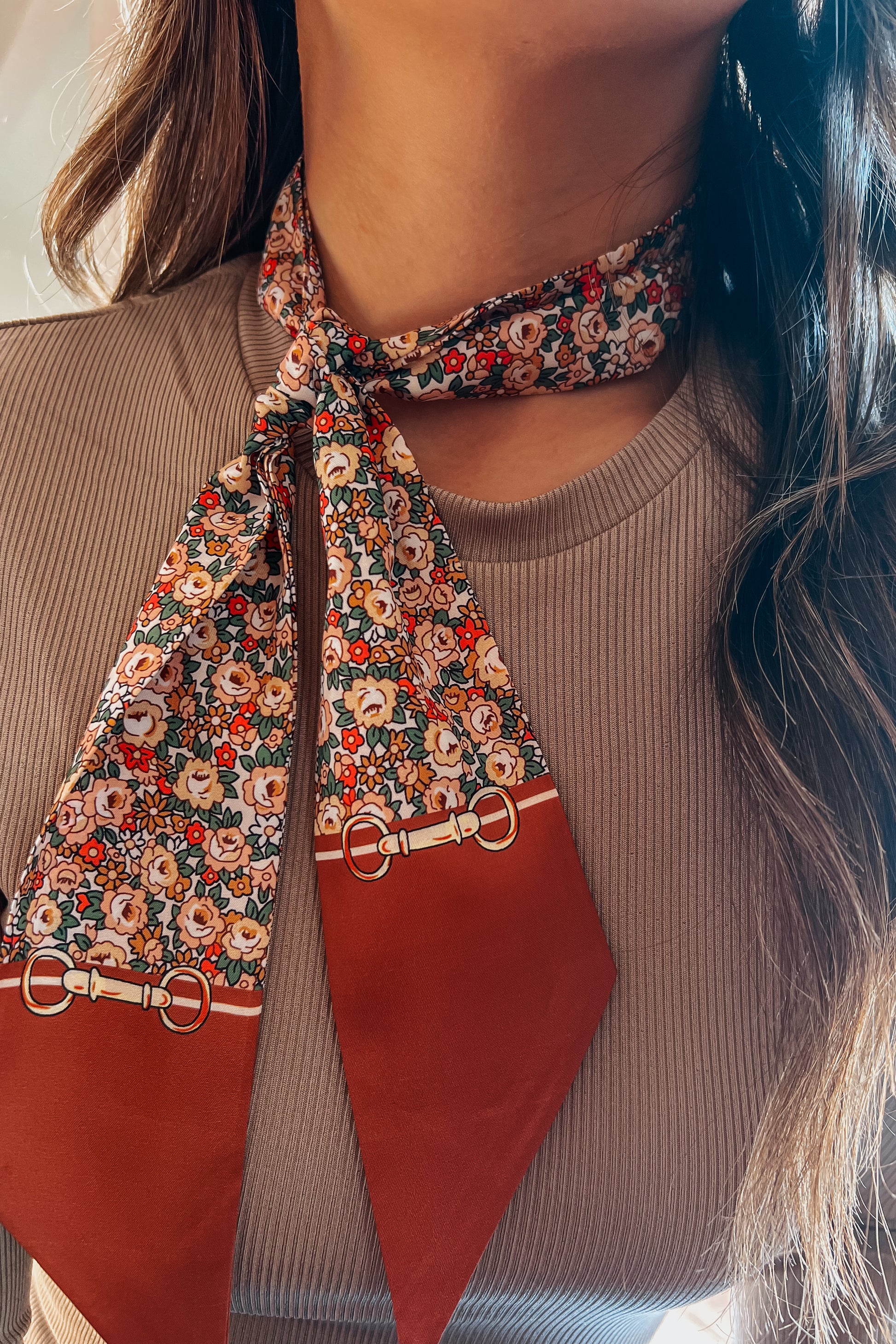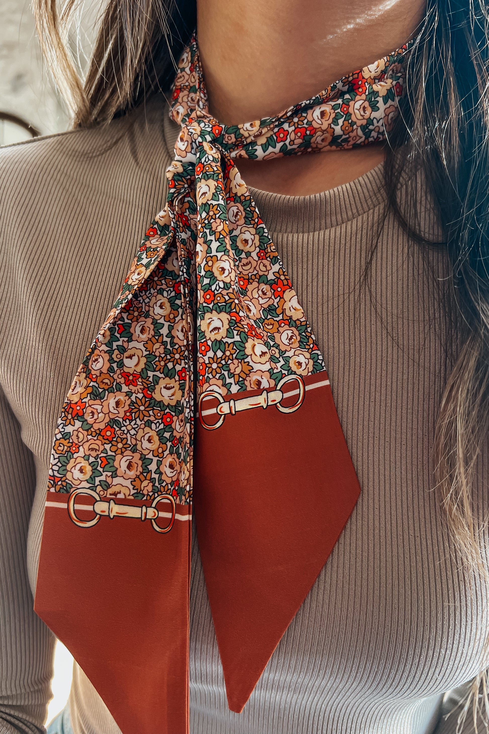 Add a touch of western charm to any look with our flocal rust Twilly. This versatile accessory can be styled a dozen ways — tie it around your neck, wrap it on your hat, use it as a hair ribbon, or accent your favorite handbag. The warm brown tones and classic stripe pattern make it the perfect finishing touch for any season.